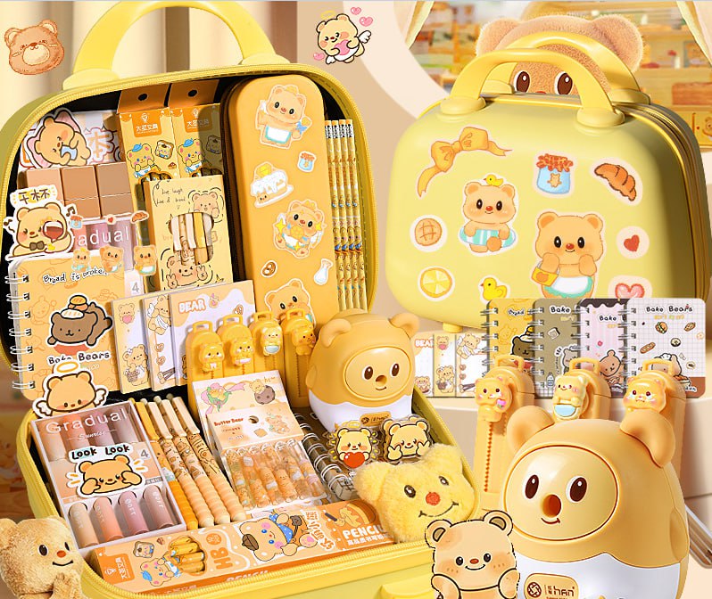 Тематичний набір канцелярії, виконаний у теплих коричневих тонах. Всі елементи прикрашені зображеннями милого ведмедика та його друзів.